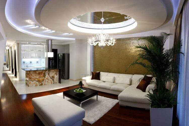 При помощи навесных конструкций можно сделать фактически любой модный проект по украшению потолка в зоне для приема гостей. Часто для этого используют листовой гипрок.