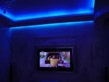 Подсветка из неона на поверхности потолка – стеклянные трубки по периметрам, в середине которых двигается инертный газ. Поверхность внутри стекла накрыта порошком люминофора. На концах трубки – электроды. Напряжение от сети вызывает свечение люминофора, притом такое, какого цвета порошок. В большинстве случаев он подходит плану декоратора, но не идет в урон интерьеру. Для голубых стен красную неоновую подсветку не заказывают.