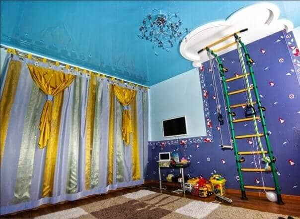 Хорошие эксплуатационные свойства, безопасность в экологическом плане дают возможность применять потолки натяжного типа в комнате для детей, на фотографиях продемонстрированы разные варианты подобного варианта облицовки.