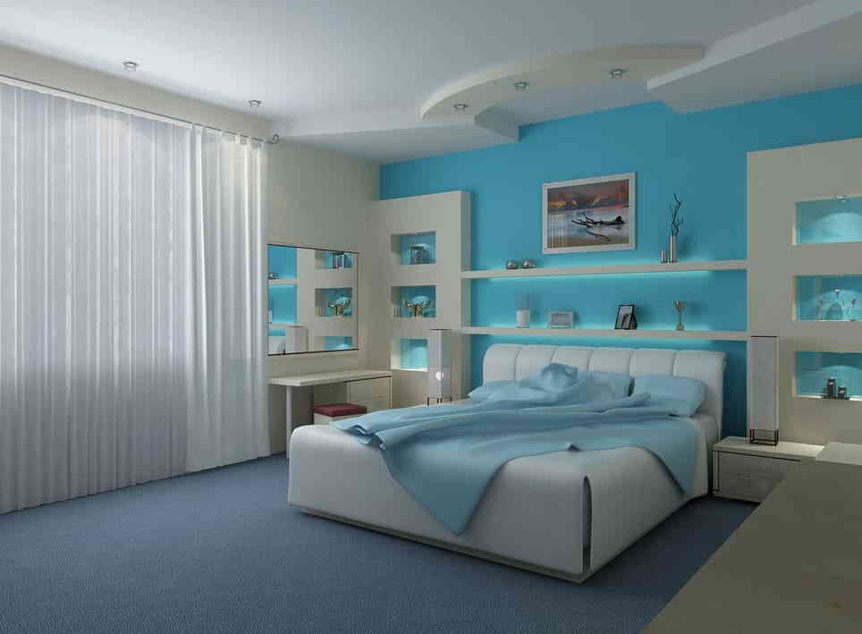 Такое комбинирование будет оптимально смотреться с третьим компаньоном, в роли которого выступит яркий серо-бежевый или белый цвет. На фоне нежно-голубых стен прекрасно выглядит серебристая, серая мебель, а серые плоскости отлично оттенят шторы в спальной комнате голубого цвета.